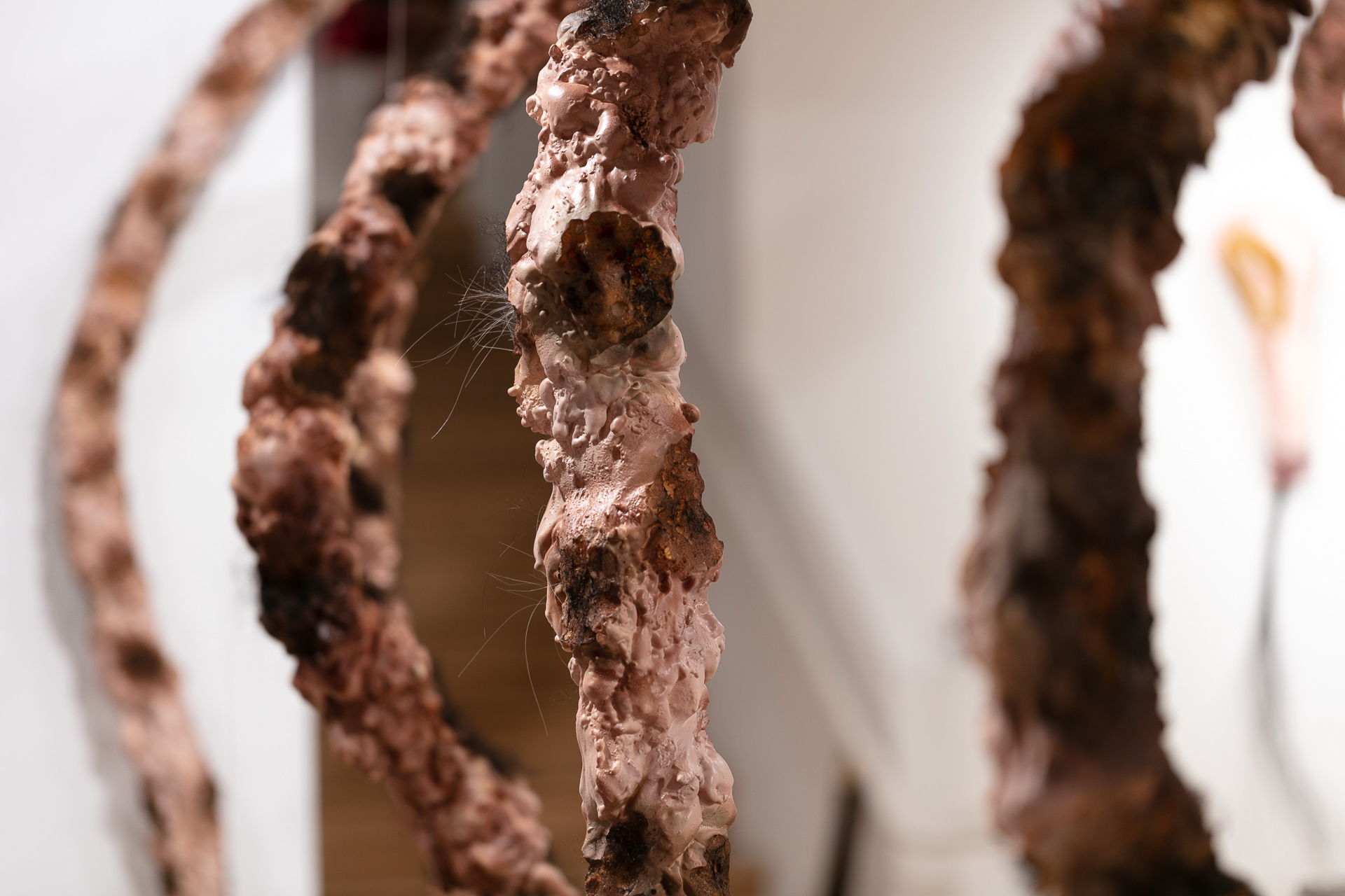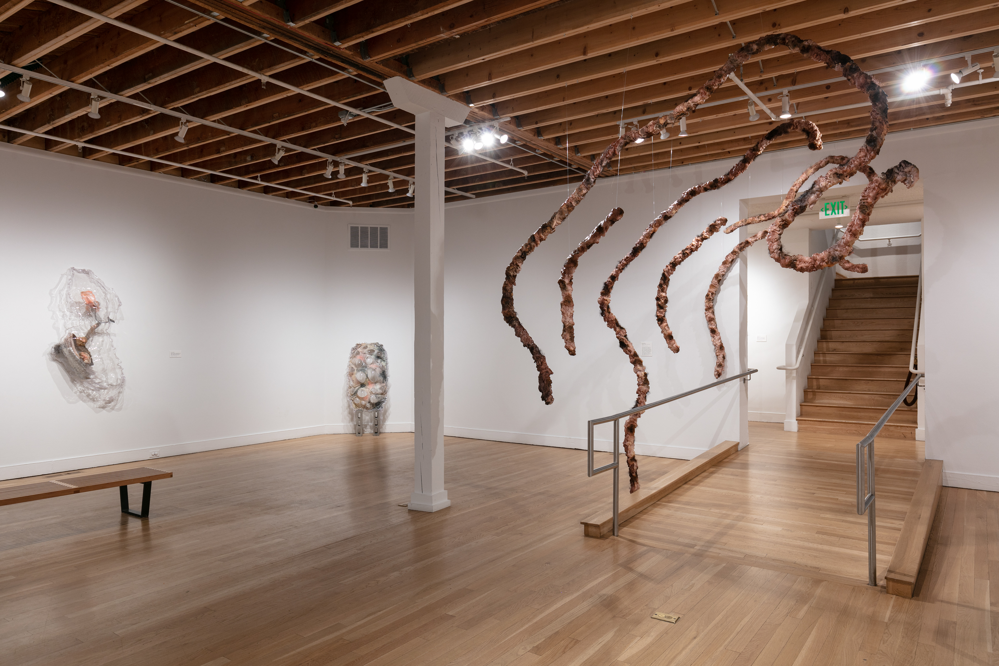 This site-specific installation is a meditation on loss, grief, and the reconstruction of an absent body. The rib-like armatures trace and recall the shape of a nonbinary model, who Grabowska photographed in poses of embracing, kneeling, and sheltering. The artist has suspended the work over a threshold between the galleries. The installation connects a space of transition to sensory membranes and tunnels, such as the birthing canal and mouth, that translate our inner life to the outer world and vice versa.