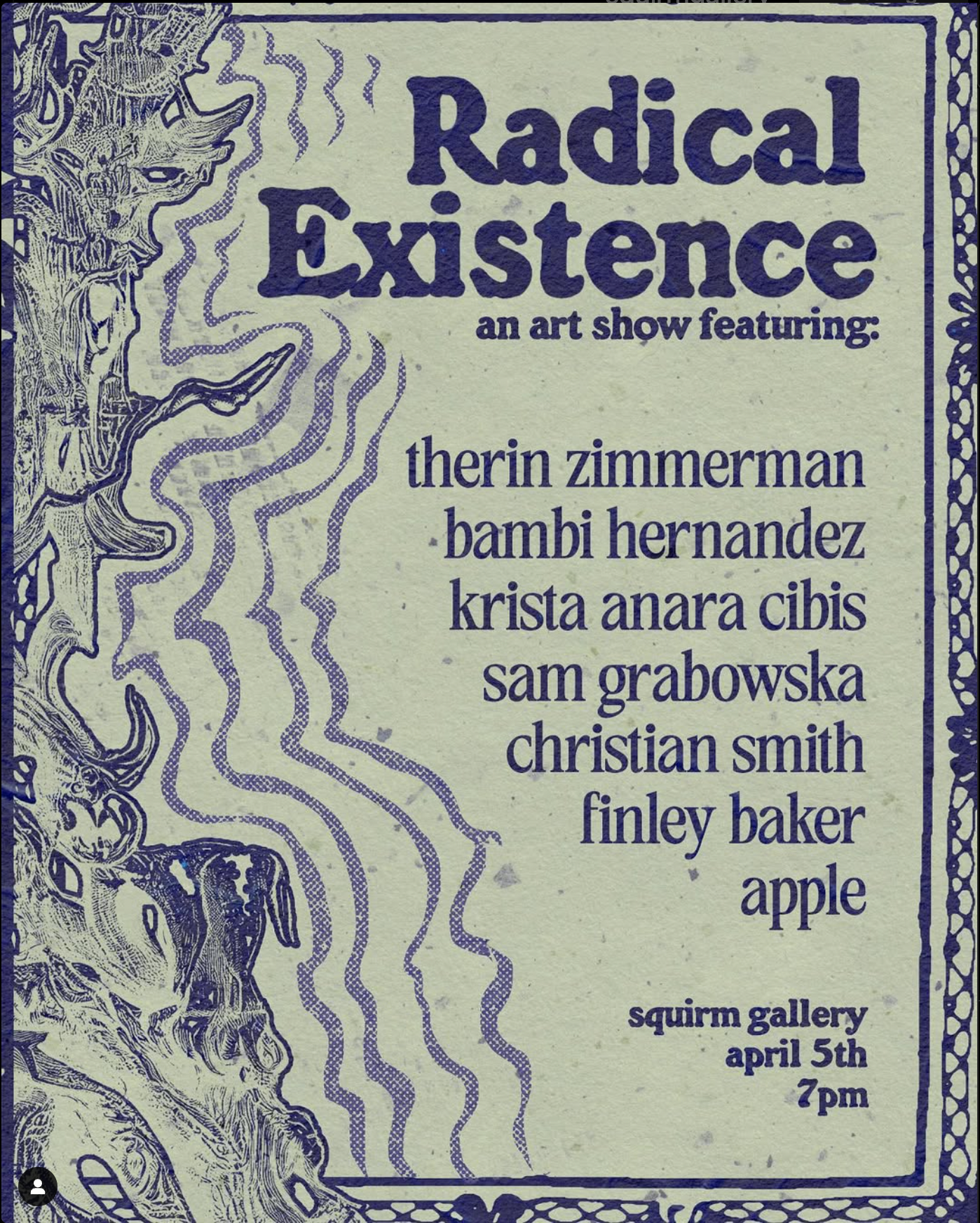 Radical Existence opens April 5th, 2025 at 7pm at Squirm Gallery.